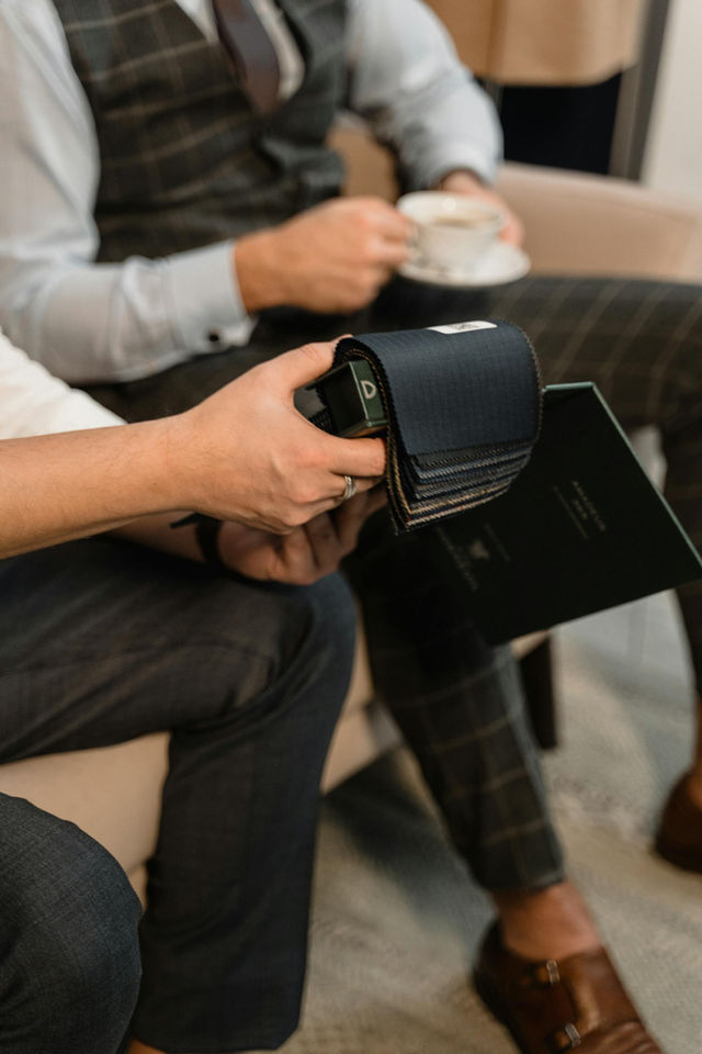 Maßkonfektion - das heißt: nur Maß nehmen, aber nicht schneidern. Anhand von Schlupfteilen erfolgt die sorgfältige Vermaßung. Aus über 2000 Stoffmustern wertvoller Stoffe internationaler Webart namhafter Stoff- und Tuchweber aus ganz Europa wählen Sie Ihren Wunschstoff aus. Unsere ebenso exklusiven wie nachhaltigen Anzüge und Maßhemden, die in Farbe, Schnitt und Stil, in Kragen-, Manschetten- und Passform variabel sind, werden dann auf höchstem Schneiderniveau in Deutschland oder der Schweiz gefertigt.